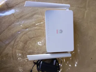 Router inalámbrico de la marca Huawei en color blanco. Incluye su adaptador de corriente. - Dos antenas externas. - Diseño compacto y moderno.