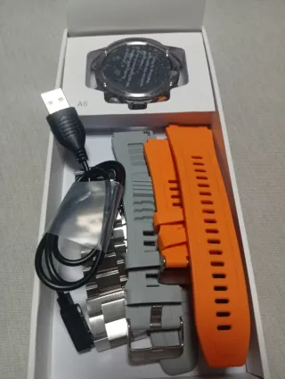 Smartwatch A6 en perfecto estado, listo para estrenar. Incluye accesorios para personalizar tu estilo. - Correa de metal plateada. - Correa de silicona naranja. - Correa de silicona gris. - Cable de carga USB. Fue un regalo que no terminó de gustarme valorado en 40€. Abierto solo para verlo