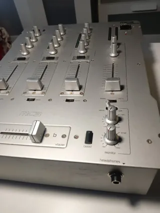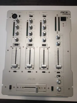 Mesa de mezclas Akiyama MC3 en color plateado. - Tres canales independientes. - Ecualizador de 3 bandas por canal. - Crossfader. - Salida de auriculares. - No incluye cable de alimentación - Buen estado, poco usada y bien conservada