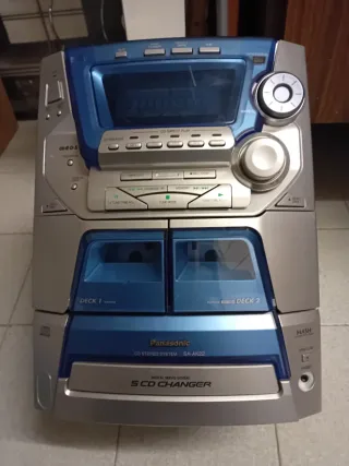 Cadena de música Panasonic con reproductor de 5 CDs. - Doble pletina de cassette. - Sintonizador de radio. - Pantalla digital.