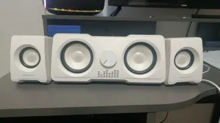 Sistema de altavoces de 2.1 canales con un diseño moderno y elegante. - Altavoz central con dos drivers y control de volumen. - Dos altavoces satélite compactos. - Acabado en color blanco.