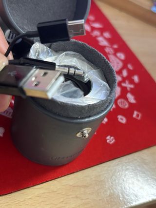 Altavoz portátil Lifetrons con acabado metálico. - Incluye cable de carga USB. - Viene con su funda protectora. - Etiqueta de advertencia sobre el cuidado de la membrana.