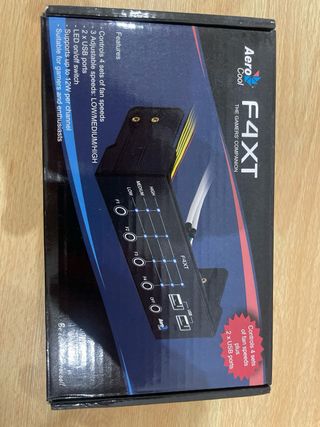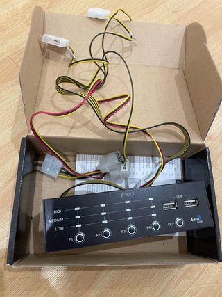 Controlador de ventiladores Aero Cool F4XT en perfecto estado. Incluye 2 puertos USB. - Controla la velocidad de 4 ventiladores. - 2 puertos USB 2.0. - Interruptor LED. - Soporta hasta 12V por canal. - Adecuado para juegos y entusiastas.