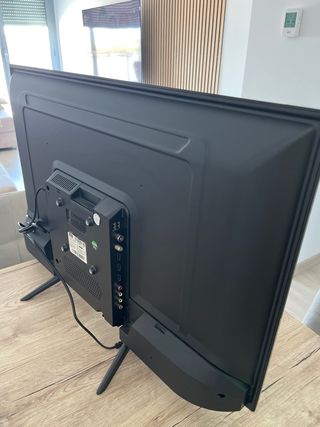 Televisor (no smart TV) con pantalla plana. - Soporte incluido. - Mando a distancia (con pilas). - Incluye cable de antena. PD: 3 puertos hdmi, lector de usb.