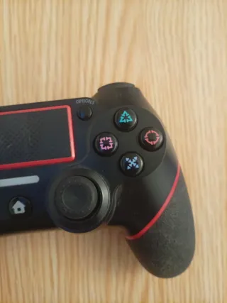 Mando de videojuegos en color negro con detalles en rojo. - Diseño ergonómico. - Botones frontales con símbolos de colores. - funciona con cable.