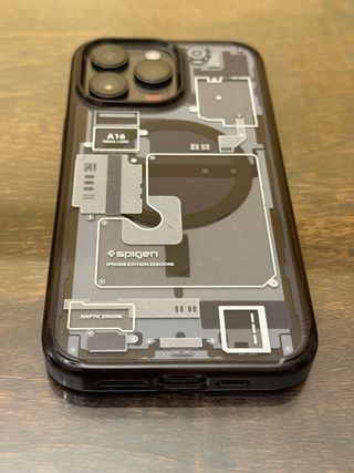 Lleva funda Spygen con diseño de componentes internos para iPhone 14 Pro Max. Funcionamiento perfecto, unicamente presenta pequeñas marcas de uso en los bordes metalicos, y muy leves arañazos inapreciables. con las protecciones se ve perfecto. La bateria esta al 83%. Le queda mucha vida, pero me han regalado el 17 pro max 🤷🏻♂️