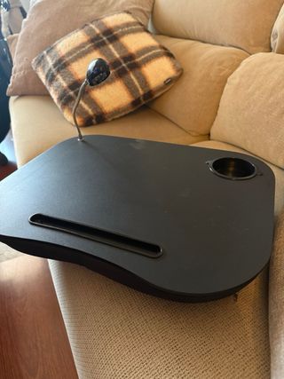 Mesa portátil negra con un diseño funcional. Ideal para usar el portátil o leer cómodamente. - Incorpora una luz LED flexible. - Dispone de un hueco para bebidas. - Ranura para tablet o móvil.
