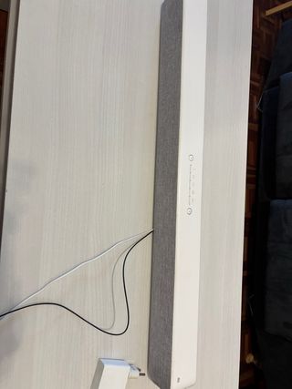 Barra de sonido con un diseño moderno y elegante. - Acabado en tela gris y detalles en blanco. - Controles integrados en la parte superior.