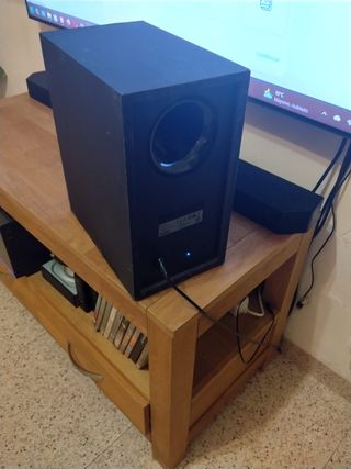 Sistema de sonido envolvente con barra de sonido y altavoces. - Barra de sonido principal. - Dos altavoces satélite. - Subwoofer. - Mando a distancia - Diseño elegante en color negro. Bien cuidado y en perfecto funcionamiento