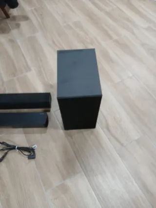 Sistema de cine en casa Philips con altavoces y subwoofer activo. Funciona a la perfección se escucha genial. Los cables vienen con su color para una rápida conexión.