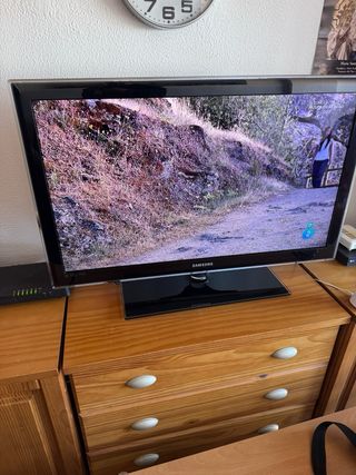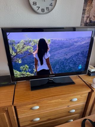 Televisor marca Samsung, 37 pulgadas, modelo UE37C5100QW. Con soporte de pie. No es Smart TV. En general el televisor esta bastante bien, multiples conexiones (4 HDMI, 2 USB, Euroconector); mando original funcionando perfectamente. Lo unico que le ocurre es que el sonido, si se sube mucho, los altavoces se distorsionan. Con las voces no hay problema, se nota sobre todo cuando hay sonidos más agudos (en peliculas, por ejemplo las explosiones, golpes, etc. Si se le puede adaptar una barra de sonido, por ejemplo, este problema se solucionaría. Respecto a la calidad de imagen, la TV se ve perfecta.