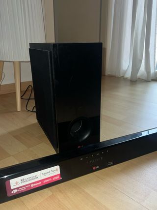 Sistema de sonido LG con barra y subwoofer. - Diseño elegante y moderno. - Potente sonido envolvente. Hay q revisar subwoofer(no funciona)