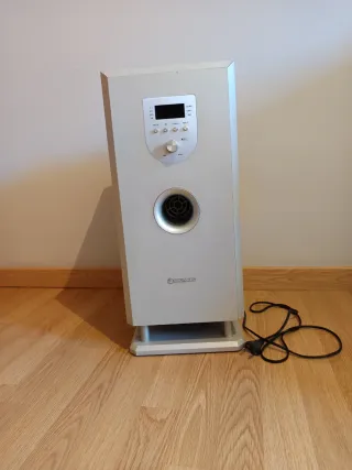 Sistema de Home Theatre System Grunkel modelo CCG-01D. Solo incluye una unidad central (Subwoofer activo de 100W RMS para bajos profundos y resonantes. Su diseño es vertical. Tiene tres entradas estéreo (ST1, ST2, ST3) para conectar diversas fuentes de audio (TV, reproductor, consola, etc.). Entrada 5.1 (AC-3): Conexiones RCA específicas para sonido envolvente 5.1. Y Varias salidas de altavoces. Esta bastante bien, a pesar de tener varios desconchones en algunas esquinas (se adjunta foto de ellos🤷) causa del uso y el paso del tiempo. 57 cm de alto 24'5 cm de ancho 34 cm (aprox) de profundidad contando con la rejilla de detrás.