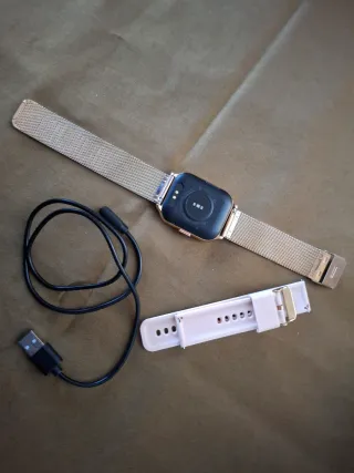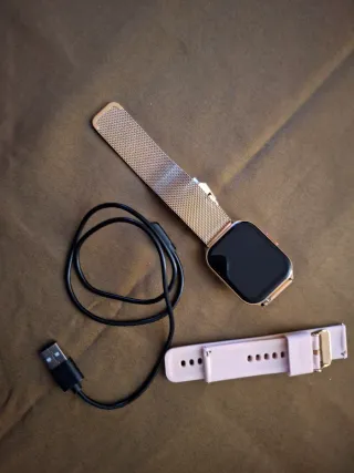 Reloj inteligente con un elegante diseño. - Correa de malla en tono oro rosa. - Correa adicional en color rosa pálido. - Cable de carga USB incluido. Lo compré en Amazon y no tengo la caja por lo que no sé la marca exacta. Está en perfecto estado, me lo he puesto una vez.