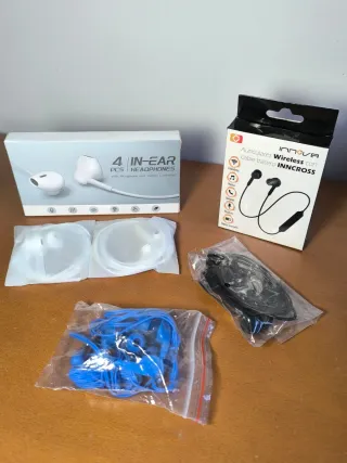 Pack de 10 auriculares que incluye: - Auriculares inalámbricos negros (1 unidad) - Auriculares por cable blancos (6 unidades) - Auriculares por cable azules (2 unidades) - Auriculares por cable negros (1 unidad)