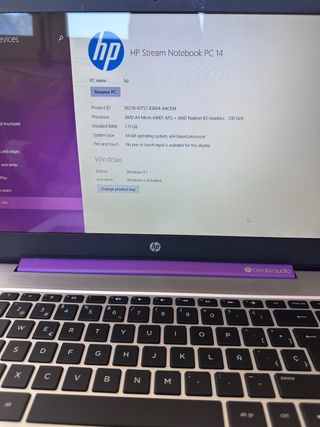 Portátil HP Stream 14 con sonido Beats Audio. Diseño elegante en color plata y morado. - Pantalla de 14 pulgadas. - Procesador AMD. - Gráficos AMD Radeon R3. - Sistema operativo Windows 8. -Funciona con el cargador puesto!
