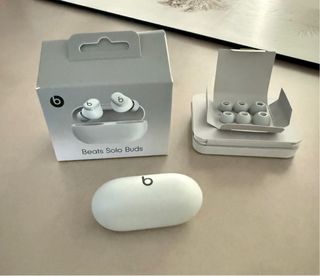 Auriculares inalámbricos Beats Solo Buds en color blanco. - Diseño compacto y ergonómico. - Estuche de carga incluido. Se vende por cambio de domicilio y limpieza de trastero, precio NO negociable.
