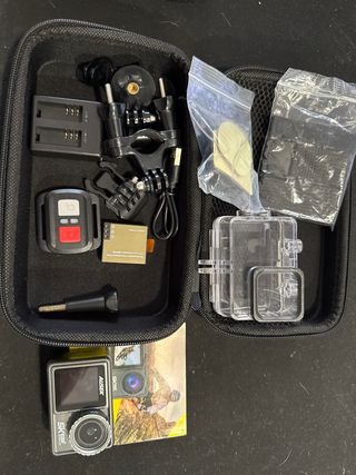 Cámara de acción AUSEK S81TRW en color gris y plateado. - Resolución 5K Ultra. - Pantalla frontal. - Lente de alta calidad.