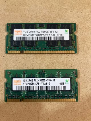 Se venden dos módulos de memoria RAM SO-DIMM Hynix. Obtenidas de despiece - Módulo 1: 1GB 2Rx8 PC2-5300S-555-12 (HYMP512S64CP8-Y5 AB-C) - Módulo 2: 1GB 2RX16 PC2-5300S-555-12 (HYMP112S64CP6-Y5 AB-C)