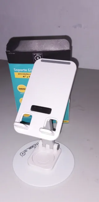 Base móvil con soporte giratorio para tablet. Permite ajustar el ángulo de visión. - Base giratoria 360 grados. - Soporte ajustable en altura e inclinación. - Diseño estable y moderno.
