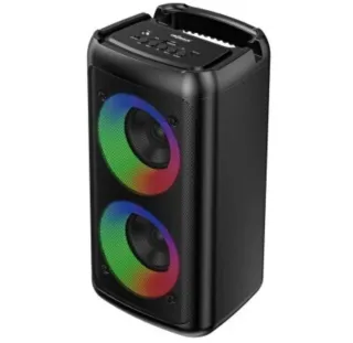 Altavoz portátil con múltiples funciones. - Conectividad Bluetooth. - Radio FM integrada. - Diseño moderno con luces LED. - Asa para fácil transporte.