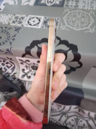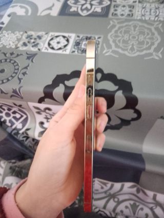 Teléfono móvil iPhone 12 Pro Max con acabado dorado. - Capacidad de almacenamiento de 128GB. -Parte de arras agrietada pero no impide su funcionamiento, las camaras traseras van genial . -todo lo demas esta perfecto -se regalads cable cargador y un bolson de fundas