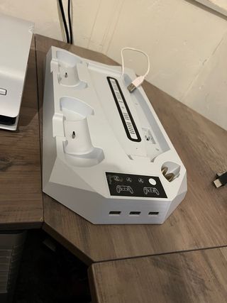 Base de carga para mandos de PlayStation 5 con puertos USB adicionales. - Carga hasta dos mandos simultáneamente. - Incluye 3 puertos USB para conectar otros dispositivos. - Diseño moderno y compacto.