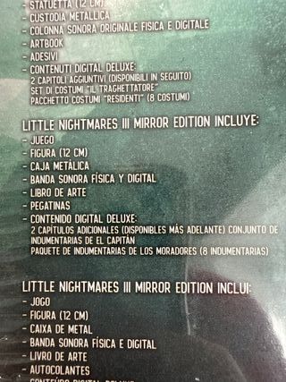 Edición Mirror Edition del videojuego Little Nightmares III para PlayStation 5. El juego está nuevo y precintado. PRECIO NO NEGOCIABLE - Edición especial Mirror Edition. - Plataforma: PS5. - Desarrollado por Bandai Namco.