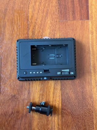 Panel de luz LED portátil. - Incluye filtros (difusores) de luz (morado, naranja y blanco) - Montura estándar para trípode o zapata de cámara. En perfecto estado. Con pilas de 1.5V en vez de 1.2V se nota mucho cambio de intensidad.