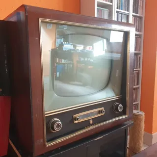 Televisor antiguo de la marca Philips, modelo 17 TX 140 A, de los años 50. Diseño clásico en madera y detalles dorados. Medidas aproximadas 57,5 cm. ancho, 55 alto y 47,5 fondo. Falta un botón y desconozco si funciona, perfecto como decoración vintage. - Carcasa de madera. - Detalles en color dorado.