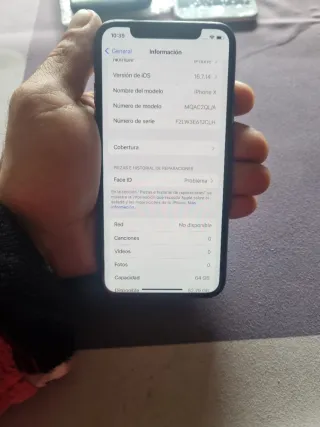 iPhone X en excelente estado, como si fuera nuevo. Capacidad de 64 GB. El chasis esta en perfecto estado todo funciona perfectamente, menos el reconocimiento facial que no se habré. Bateria 100% de capacidad, se entrega con su cargador - Modelo: iPhone X - Color: Negro - Capacidad: 64 GB - Versión de iOS: 16.7.14