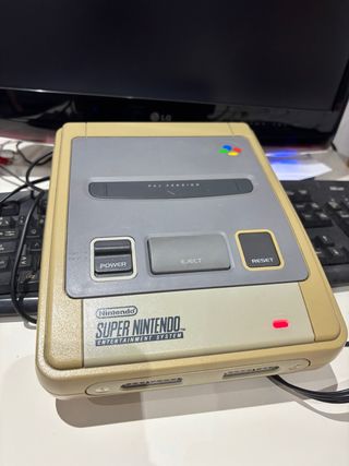 Consola Super Nintendo en color beige y gris, ideal para piezas o para quien busque componentes específicos. - Modelo PAL. - Botones de Power y Reset. - Bandeja de expulsión de cartuchos. -Para piezas o reparar enciende pero no da imagen .