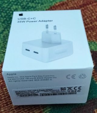 Adaptador de corriente Apple de 35W con dos puertos USB-C. Es un adaptador de corriente blanco, en su caja original. - Carga rápida de 35W. Envio Gratis - Dos puertos USB-C.