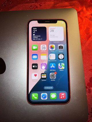 Teléfono móvil iPhone 12 en color rojo. - Pantalla de 6.1 pulgadas. - Chip A14 Bionic. - Sistema de cámara dual avanzado. - Compatible con MagSafe - Cámara frontal: ✅ - Cámara trasera: ✅ - Face ID: ✅ - Batería: 74% - True Tone: ✅ - Liberado: ✅