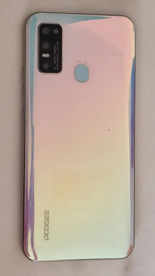 Teléfono móvil Doogee N30 con acabado iridiscente. - 4 GB de RAM - 128 GB de almacenamiento interno - Se ha caído y se ha quedado un poco abierto de la esquina inferior derecha, y no se enciende. - El móvil esta nuevo, se podría aprovechar. - La pantalla todavía tiene pegada la pegatina que trae cuando lo compras.