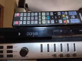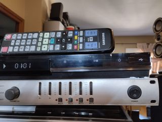 Sistema de cine en casa Samsung 5.1 con lector de Blu-ray 3D. Incluye cinco altavoces y un subwoofer. El equipo está en buen estado, con algunas señales normales de uso. - Reproductor Blu-ray 3D Samsung. - 5 altavoces. - Subwoofer.