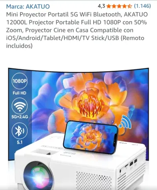 Proyector portátil AKATUO XR31 en color blanco. Ideal para cine en casa. - Conectividad WiFi y Bluetooth. - Resolución Full HD 1080P. - Zoom del 50%. - Compatible con iOS/Android/Tablet/HDMI/TV Stick/USB. - Incluye mando a distancia. Nos han regalado otro más actual para el niño y este ya no lo usamos. No tiene nada roto . Todo perfecto y funcionando.