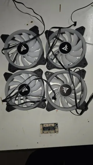 4 ventiladores marca Tempest + HUB. Son de 5 pines. No se les puede controlar velocidad ni color. Color por defecto "arcoiris" No sé conectan a la placa base, solamente a la fuente. No incluye cable alimentación a la fuente.