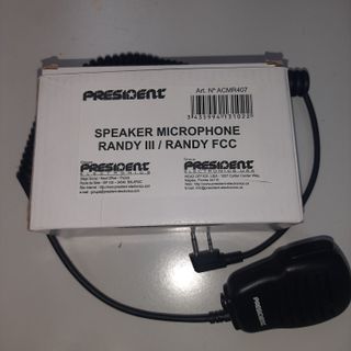 Micro-altavoz PTT con soporte de la marca PRESIDENT, modelo ACMR407, para walquie RANDY III. Cable en espiral y conector 2 pines. Totalmente nuevo. Utilizado solamente una vez y dentro de un vehículo. - Color negro. - Incluye el micro-altavoz y el cable. - Referencia: ACMR407.