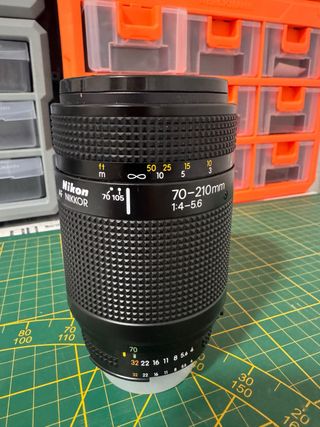 Objetivo zoom Nikon AF NIKKOR. - Rango focal de 70-210mm. - Apertura variable f/4-5.6. - Escala de distancia en metros y pies. - Escala de profundidad de campo. Se puede ver y probar