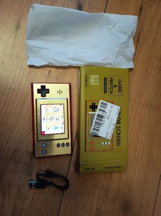 Consola de videojuegos portátil estilo retro. Es de una calidad bajisima. Tiene un cable de carga USB y creo que el que va dentro de la caja es de enchufar a la tele, pero no he querido sacarlo porque luego no hay quien lo meta.