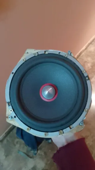 Altavoz con un diseño moderno y elegante. - Cono principal de color negro. - Detalle central plateado con borde rojo. - Marco exterior plateado.