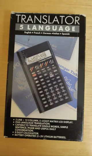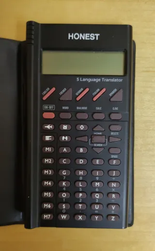 Dispositivo electrónico multifunción HONEST Nuevo - Traductor de 5 idiomas. - Funciones de calculadora. traductor electrónico de 5 idiomas de la marca Translator. Traducción en cinco idiomas: inglés, francés, alemán, italiano y español. Pantalla LCD de matriz de puntos de 2 líneas x 12 columnas. Capaz de traducir palabras sueltas, frases sencillas y conversaciones diarias útiles. Calculadora de 8 dígitos. Funciona con pilas (2 pilas de litio de 3 V).