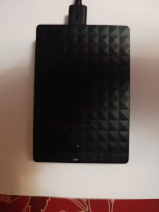 Disco duro externo de la marca Seagate con un diseño elegante en color negro. - Conexión por cable.