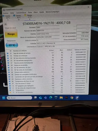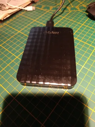 Disco duro externo de 4TB con un diseño texturizado en la parte superior. - Capacidad de 4TB. - Acabado en color negro. El informe de CrystalDisk lo muestra en amarillo (riesgo), aunque el disco funciona perfectamente