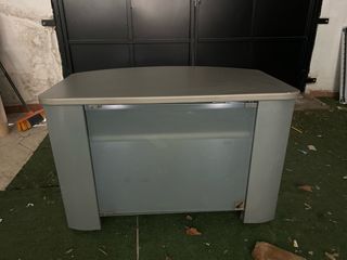 Mesa de recepción o mostrador/TV, material madera, metálico, puerta de cristal, tiene ruedas para desplazarla, en buen estado, interior de dos estantes. Medidas, 90cm ancho, 60cm profundidad, 59cm alto.