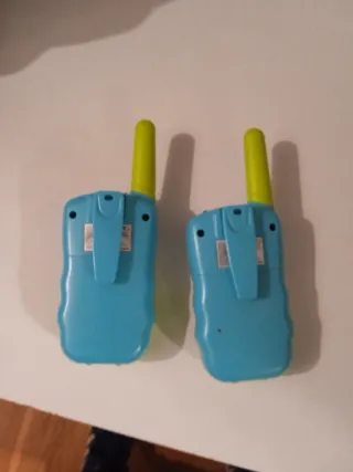 Set de dos walkie talkies en colores azul y verde, perfectos para juegos y comunicación. - Diseño ergonómico. - Antena integrada. - Pantalla digital.
