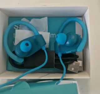 Auriculares deportivos con conexión Bluetooth. Diseñados para un ajuste seguro y cómodo durante la actividad física. Tiene adaptadores para diferentes oídos. - Diseño ergonómico con ganchos para la oreja. - Cable de carga USB incluido.