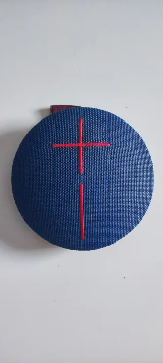 Altavoz portátil de la marca Ultimate Ears. Su diseño circular y tela resistente lo hacen ideal para llevar a cualquier parte. - Color principal: azul. - Detalles en color rojo.