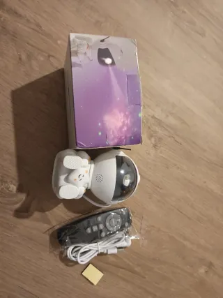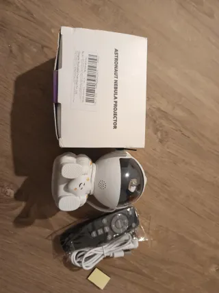 Proyector con diseño de astronauta que crea un ambiente de nebulosa. - Incluye control remoto. - Cable de carga USB. - Abierto para video promocional.
